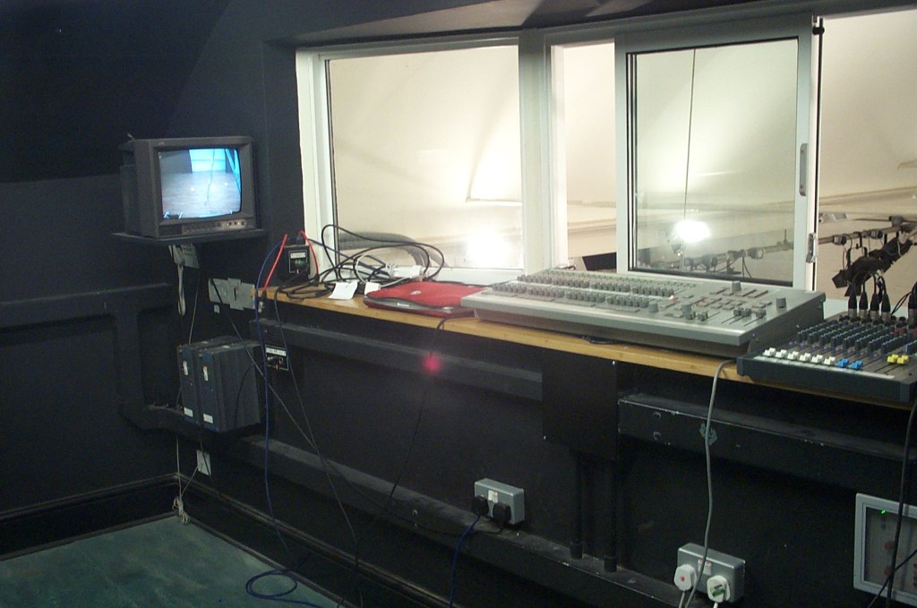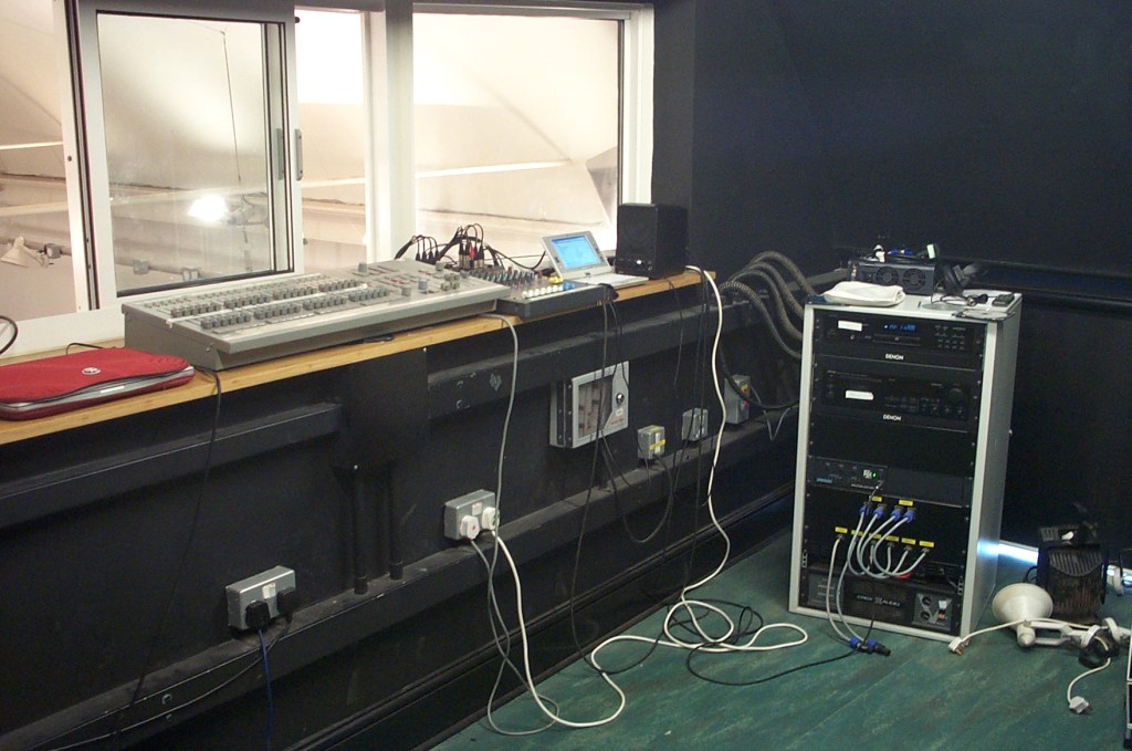 - Two mics point at the stage end of the space. One of these feeds the induction loop system, the headphone output of which drives a monitor speaker in the control room. The second of these drives a noise limiter which can cut power to the sound rack.