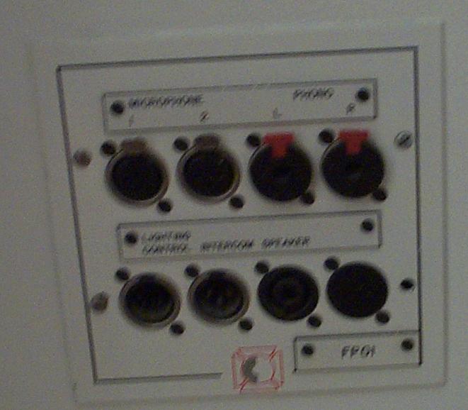 - DMX to dimmers is fed from a socket in the control room, into which you plug the desk directly, or patch the DMX from facilities panels FP01 or FP02. This is particularly useful since the control room can’t really see the stage and this allows the desk to be operated from within the space.