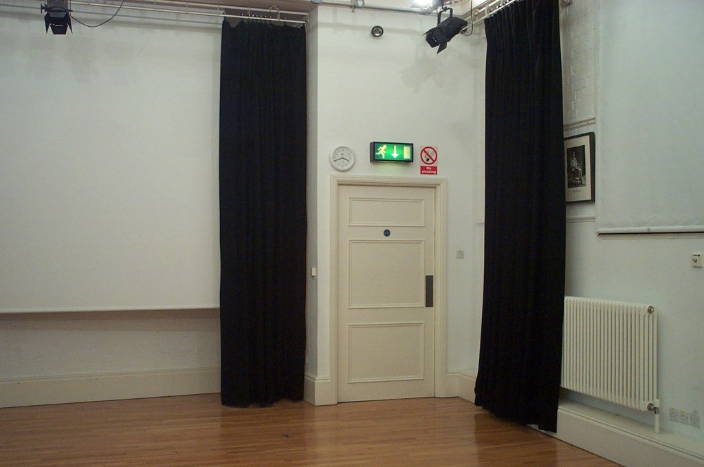 - Masking. The tabs can be arranged to usefully mask the “stage end” of the space, optionally leaving the projection screen unmasked (NB there is no installed video projector at the time of writing). Without them the walls are white.